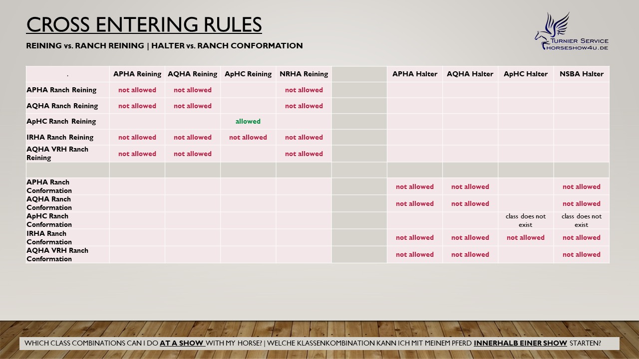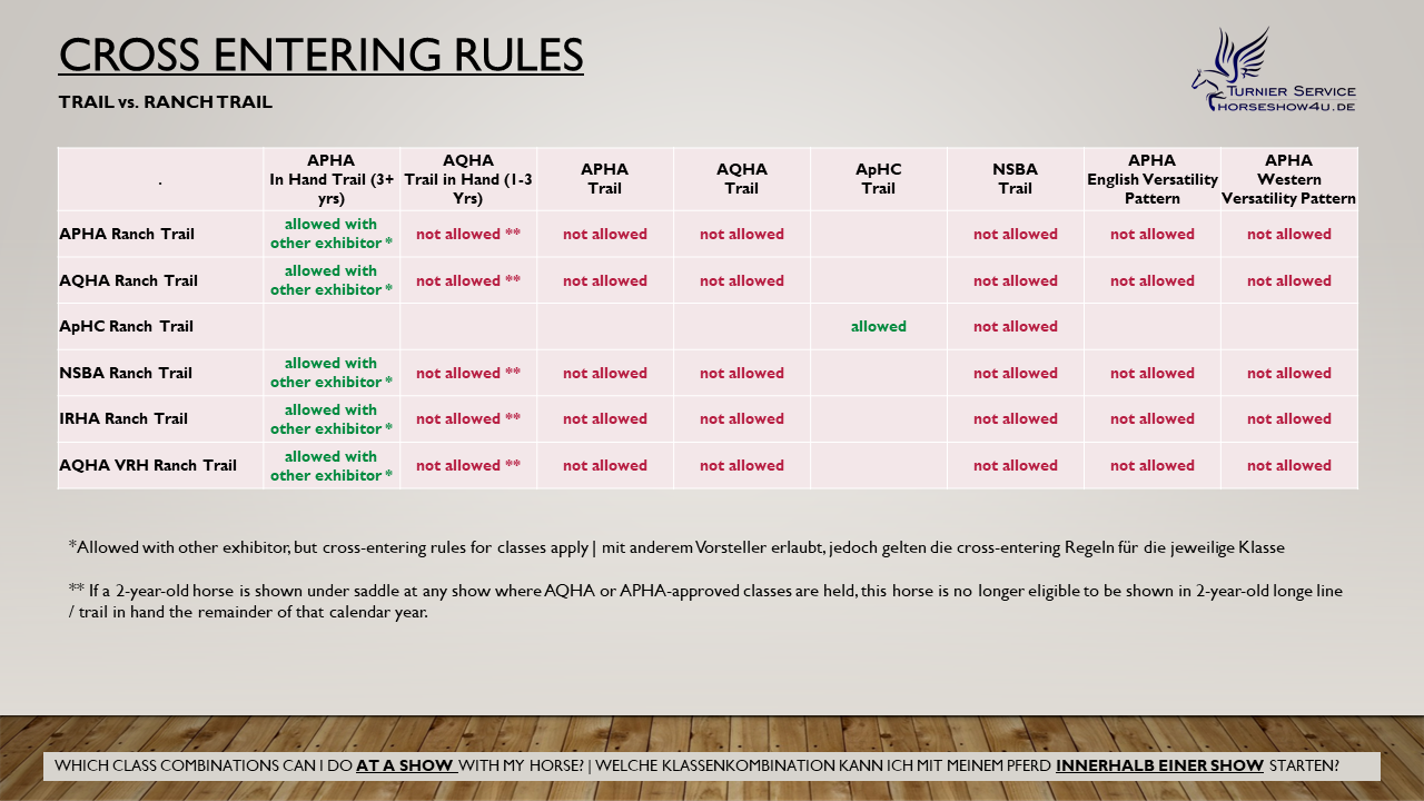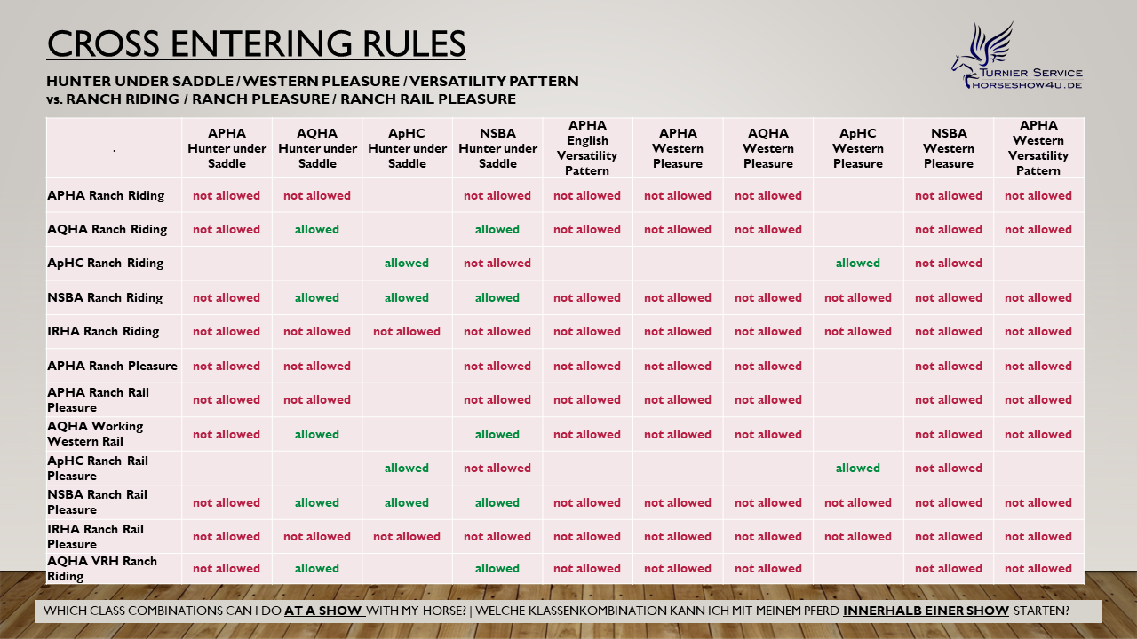Aber bevor Ihr es rausfindet noch ein Hinweis: Die Verbände - egal ob APHA, AQHA, NSBA, IRHA oder sonstige - schreiben immer at the same show . Das bedeutet die Begrenzung gilt für das komplette Turnier, nicht nur innerhalb eines Verbandes. Heißt: startet Ihr bei einem APHA & AQHA Turnier in APHA Pleasure, dürft ihr auch bei der AQHA keine Ranch Riding gehen! Und startet ihr auf einem APHA & AQHA Turnier in AQHA Hunter under Saddle, ist die APHA Ranch Riding off limits.